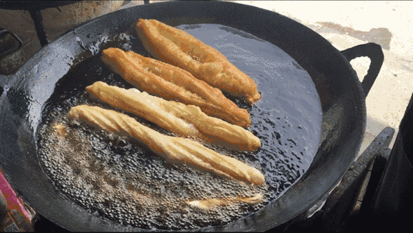 單根的面塊入油后,短短幾秒內(nèi),表層酥脆定型,限制了面塊后續(xù)的膨脹。