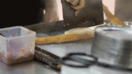蛋液順著蜂窩狀的氣孔布滿整個油條,咬開后,熱氣自下而上沖出,稍不注意便可將口腔熏出泡來。
