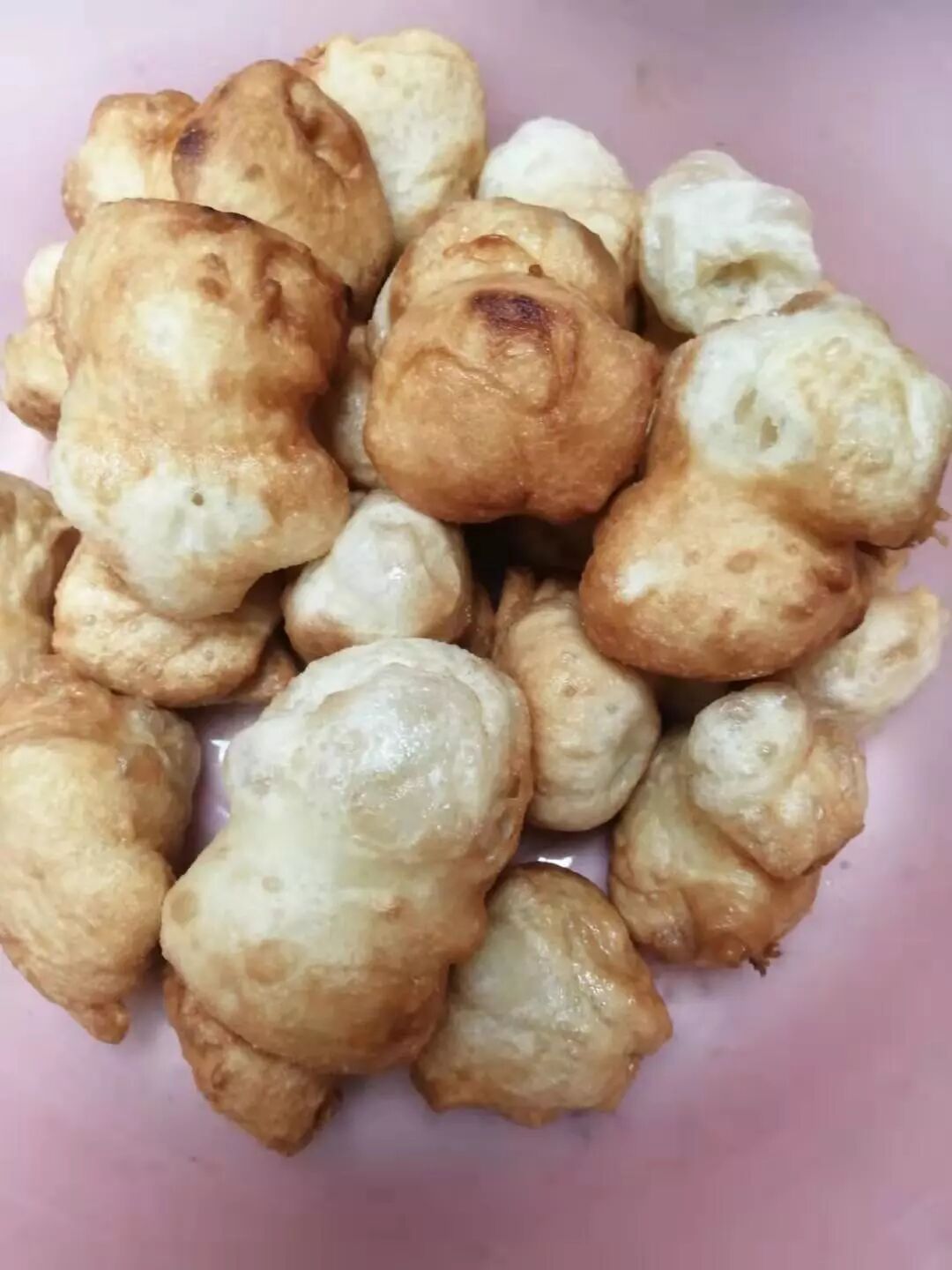 過兩遍滾油的雞蛋,較油條顏色更為金黃,表層結(jié)成略薄的焦殼。