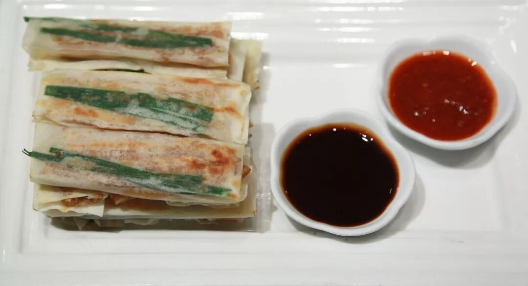 薄薄的面餅裹上剛出鍋的油條和青翠的小香蔥,平攤在鐵鍋之上壓烤,片刻后,蔥段飄出香味,透過脆黃的面皮,露出若隱若現(xiàn)的翠綠。