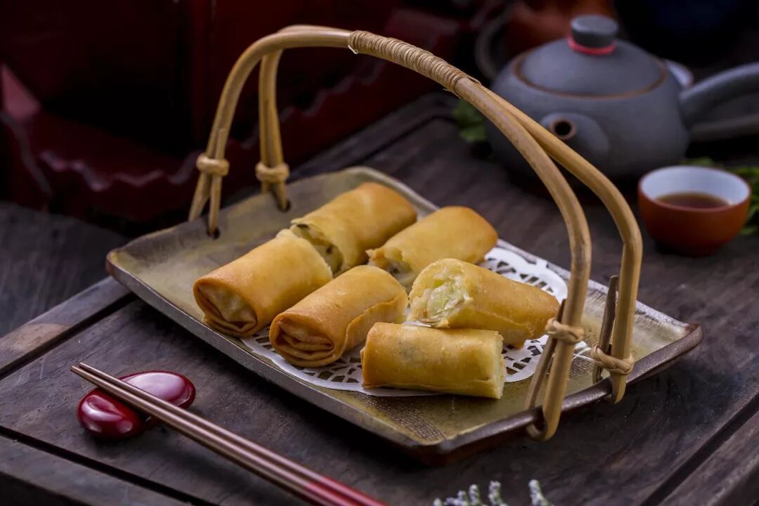 炸春卷。網(wǎng)油腰卷與炸春卷極為類似,將春卷皮換成油條即可。較之春卷,網(wǎng)油腰卷酥脆之余多了些許嚼勁/視覺中國