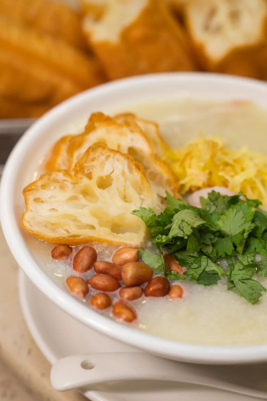 油炸的花生米和油條絲,中和海鮮粥底的腥味之余,又淡化了掛羹米粥的糊口之感。