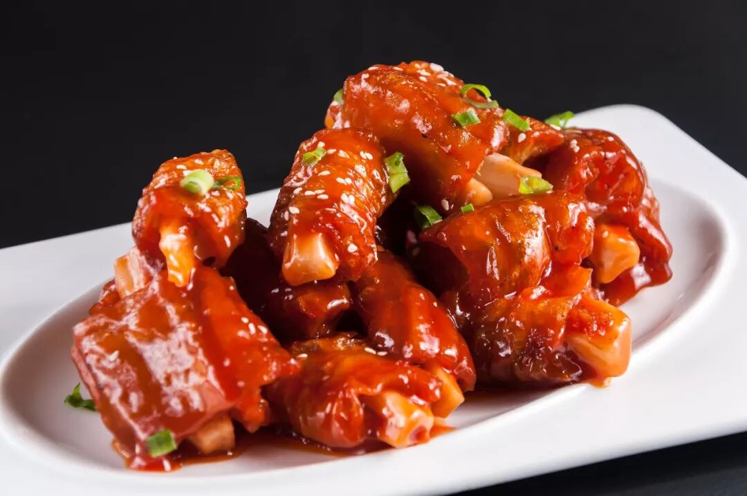 油條塊裹上醬色粉芡,宛若濃油赤醬的紅燒排骨段。